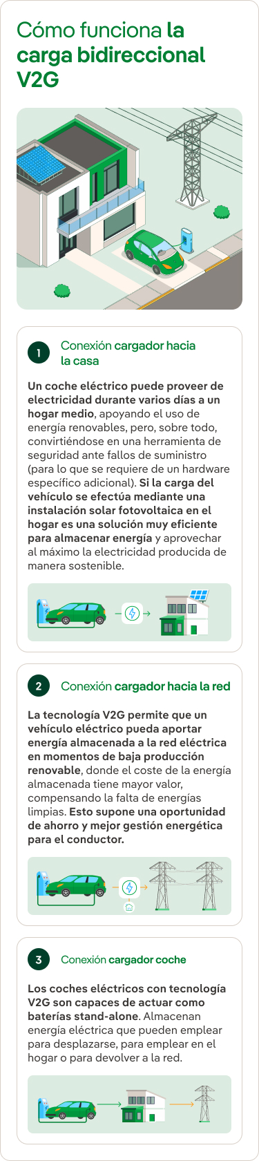 La tecnología V2G o vehicle to grid ofrece la posibilidad de aprovechar el coche eléctrico como si de una batería estacionaria se tratara, capaz de almacenar energía eléctrica a través de un punto de carga y moverse sin emisiones, pero también de devolverla a la red. En este caso existen dos vías: devolverla a la red para que esos KWh se utilicen en otro punto del sistema eléctrico, o bien aprovecharla directamente en el hogar del propio dueño del vehículo.