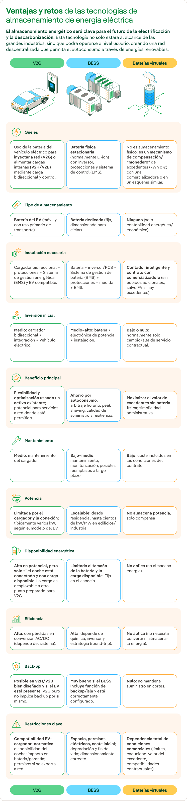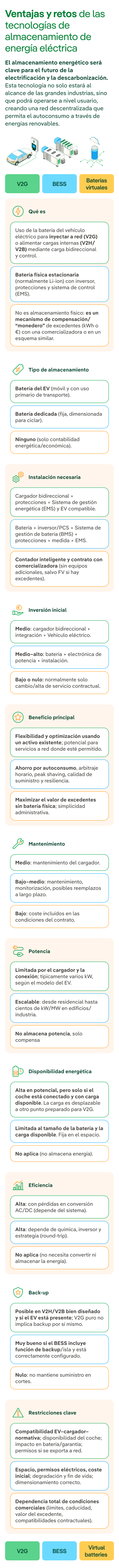 Existen diversas tecnologías de almacenamiento de energía que pueden usarse para conservar el excedente y usarlo más adelante, aumentando la eficiencia de cualquier hogar o edificio. El V2G promete convertirse en una opción que combina movilidad y almacenamiento para crear una red más descentralizada y resiliente, pero no es la única opción disponible para almacenar energía. Las baterías BESS o las baterías virtuales permiten almacenar el excedente de energía tanto en edificios como en hogares, facilitando el máximo aprovechamiento de la energía producida a través de fuentes renovables, especialmente la solar fotovoltaica.