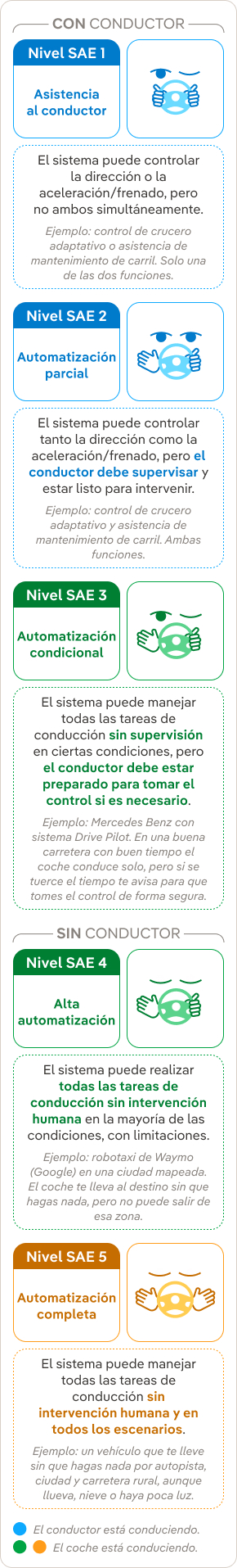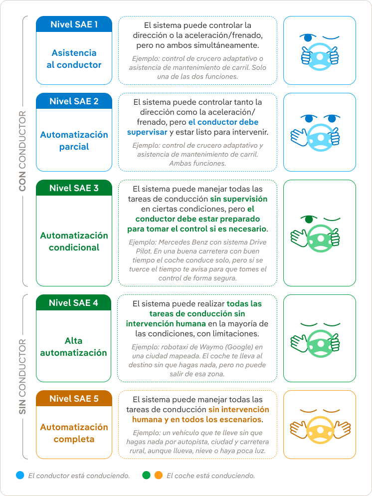 Los niveles de automatización definidos por la Sociedad de Ingenieros de la Automoción (SAE) van desde el 0, sin automatización, hasta el 5, automatización completa.