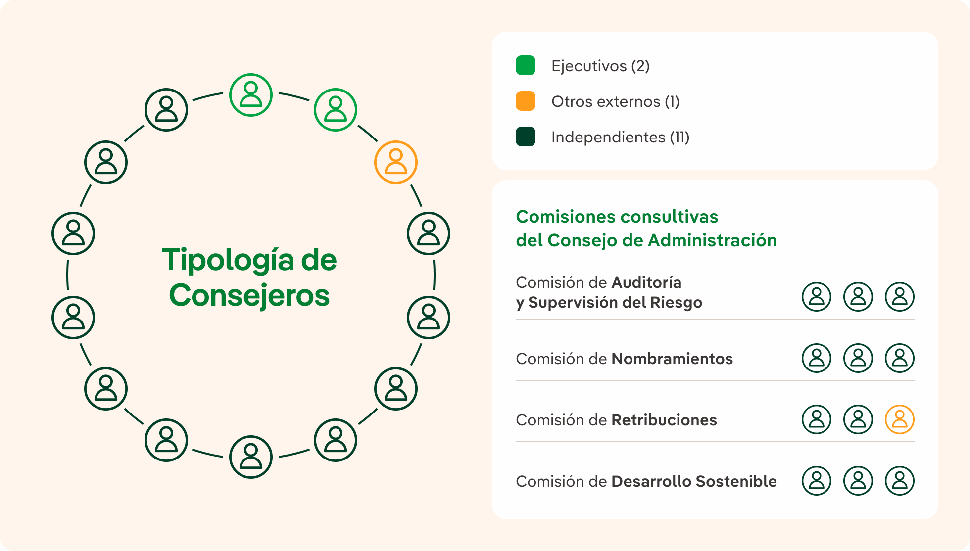 El siguiente gráfico muestra la proporción de las distintas clases de consejeros en el Consejo de Administración y en sus comisiones consultivas: