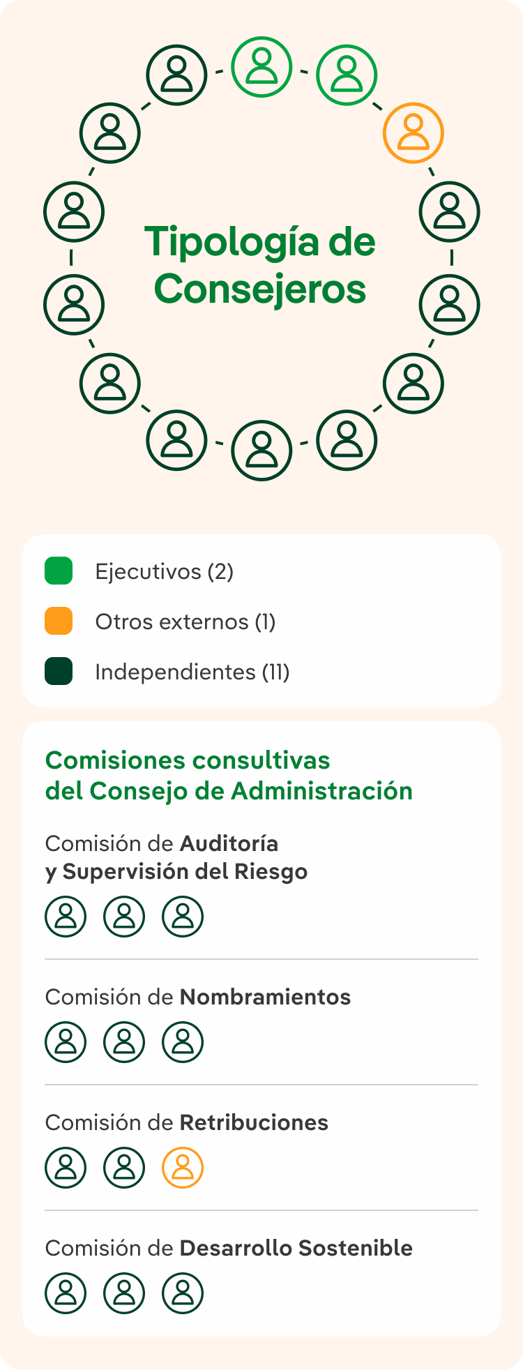 Adicionalmente, el Consejo de Administración de la Sociedad tiene constituida una Comisión Ejecutiva Delegada y cuatro comisiones consultivas: la Comisión de Auditoría y Supervisión del Riesgo, la Comisión de Nombramientos, la Comisión de Retribuciones y la Comisión de Desarrollo Sostenible.